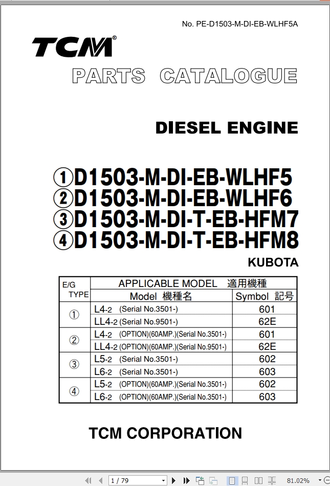 TCM D1503-M-DI-EB-WLHF5 Kubota Parts Catalogue PE-D1503-M-DI-EB-WLHF5A