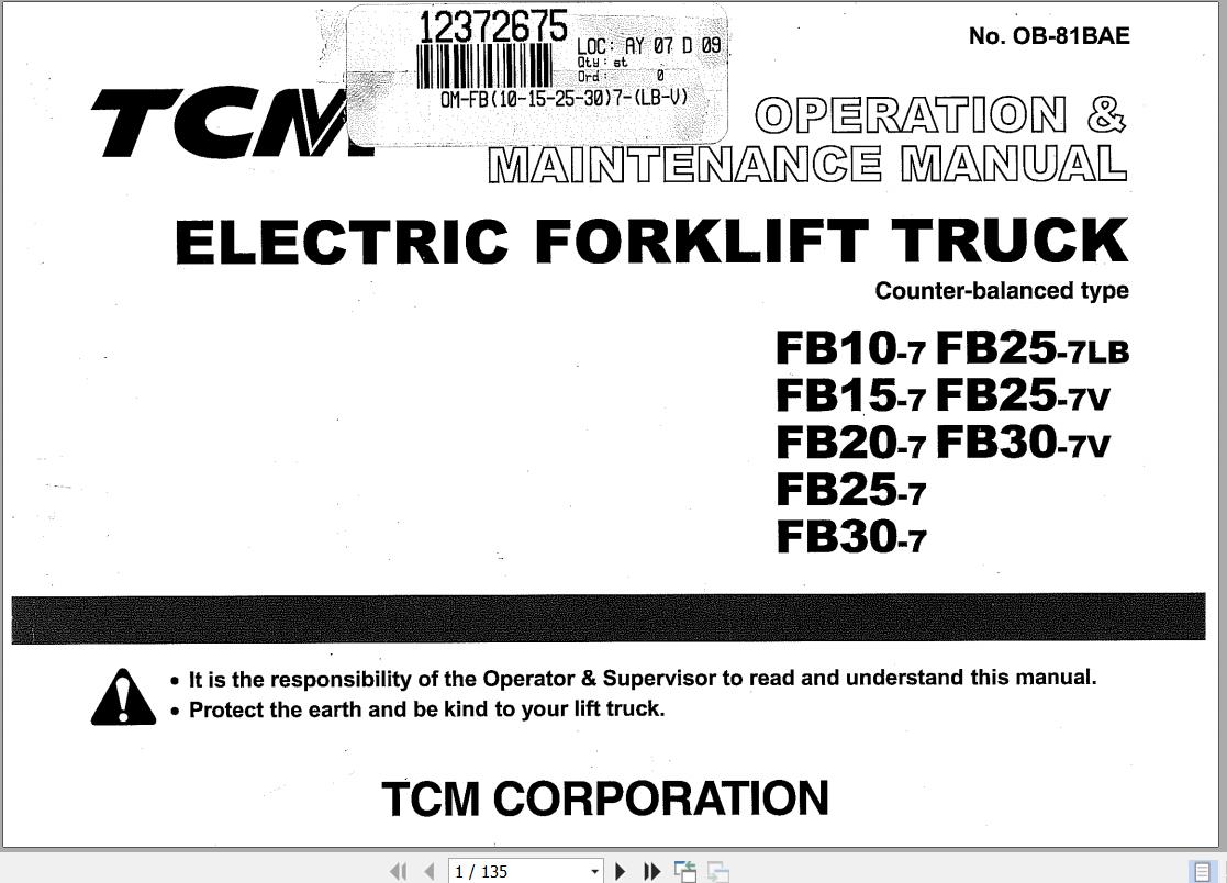 TCM FB10 FB15 FB20 FB25 FB30-7 FB25-7LV FB25-7V Operation & Maintenance Manual OB-81BAE