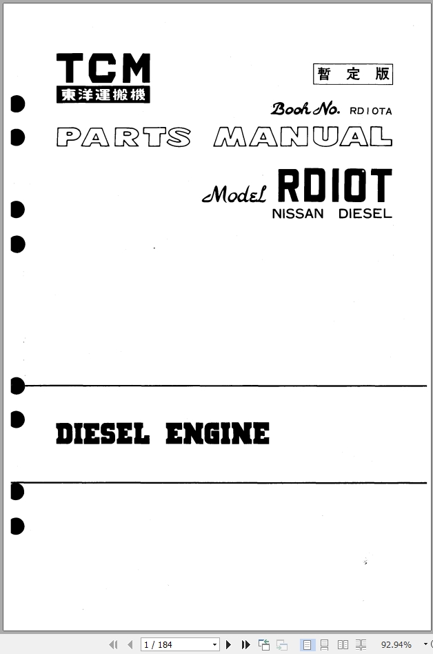 TCM RD10T Nissan Parts Manual RD10TASize: 5.2 MBMachine: Diesel EngineMachine Model: RD10T NissanPage: 184 PagesBook No: RD10TA