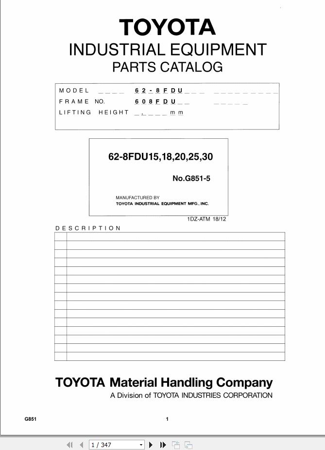 Toyota 62-8FDU15 to 62-8FDU30 Parts Catalog G851-5