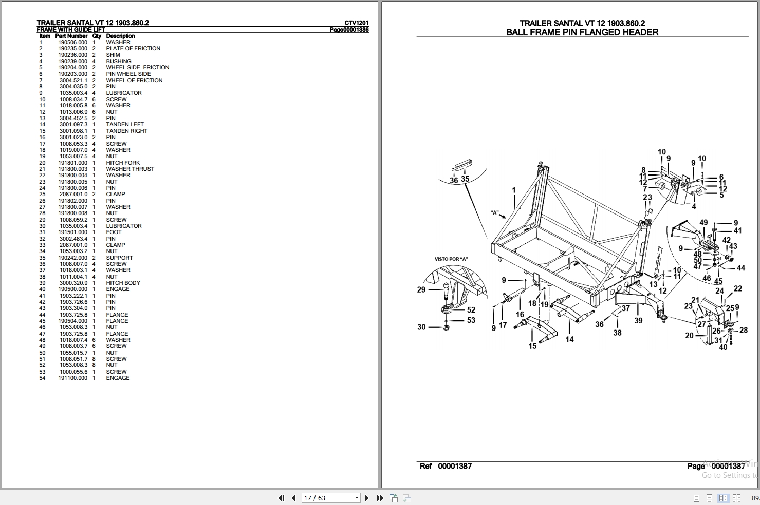 Valtra Trailer Santal VT12 Parts Catalog PDF CTV1201 Data Size: 2.64 MB File Type: PDF Language: English Manufacturer: Valtra Applicable Machine: Material Handling, Trailer Document: Parts Catalog Machine Model: Valtra Santal VT 12 Trailer Serial Number: 1903.860.2 Page: 63 Pages List Contents: Elevator Tansferidor Load Frame Lifting And Cesto Transmission Brake Master Syst. Pneum. For Transhipment Single Spring Brake Wheel Assy Pneumatic System For Transhipment Front With Spring Brake Frame With Guide Lift Ball Frame Pin Flanged Header Assy Axle Wit Brake Spring Brake Hydraulic System Up Cylinder Kit For Coupling Pump Tilting Cylinder Hydr.Syst. Without Valve For Transhipment- Single Hydr.Syst. With Valve 4 Way For Transhipment Front Single Hydraulic Pump Hydraulic Oil Reservoir Kit Lubrication Command 2 Elements Hydr.Syst. With Valve 4 Way For Transhipment Front Kit Lubrificação Do Cesto A Partir Da Série 2015v000150 Kit Lubrificação Do Quadro A Partir Da Série 2015v000150 Independent Actuating Circuit Hydraulic Circuit Independent For Command Pneumatic Electrical System