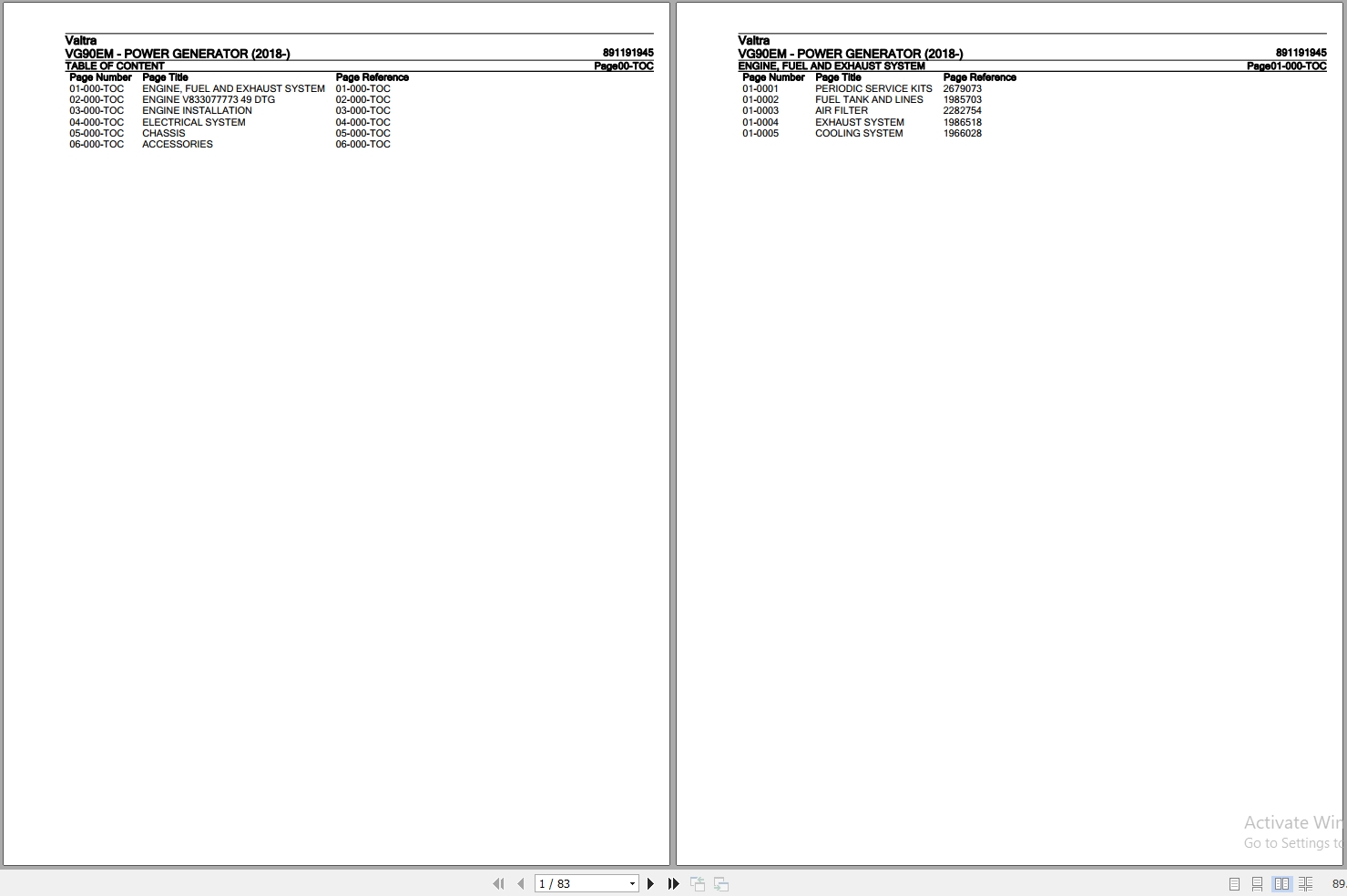 Valtra VG90EM Parts Catalog PDF 891191945 2018 - Data Size: 4.28 MB File Type: PDF Language: English Manufacturer: Valtra Applicable Machine: Power Generator Document: Parts Catalog Machine Model: Valtra VG90EM Power Generator (2018-) Year of Manufacture: 2018 - Page: 83 Pages List Contents: Engine, Fuel And Exhaust System Periodic Service Kits Fuel Tank And Lines Air Filter Exhaust System Cooling System Engine V833077773 49 Dtg Engine Assemblies Cylinder Block Timing Gears And Housing Flywheel And Housing Crankshaft And Pistons Camshaft And Valve Mechanism Cylinder Head Valve Rocker Cover Intake Manifold Turbocharger And Exhaust Manifold Oil Pump And Sump Oil Cooler And Filter Coolant Pump And Thermostat Fuel Injection System Fuel Filters Alternator Starter Motor Engine Overhaul Parts Special Overhaul Parts Engine Installation Electrical System Control Unit Main Wiring Harness Generator Assembly - Meccalte Chassis Decals Sound Attenuated Chassis Sound Attenuated Chassis Service Parts Accessories Control Unit - Optional Equipment Automatic Transfer Switch (Ats) - Manual - Optional Equipment Automatic Transfer Switch (Ats) - Automatic - Optional Equipment Oil Drain Pump - Optional Equipment 3-Way Valve - Optional Equipment Battery Switch - Optional Equipment Engine Preheater - Electrical - Optional Equipment