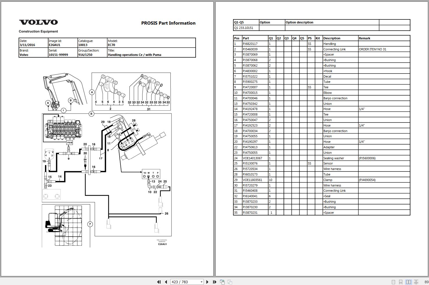 Volvo EC70 Excavator Parts Catalog