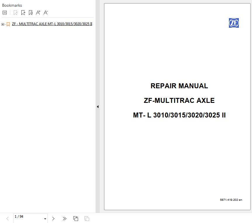 ZF Multitrac Axle MT-L3010II to MT-L3025II Service Manual 50940485